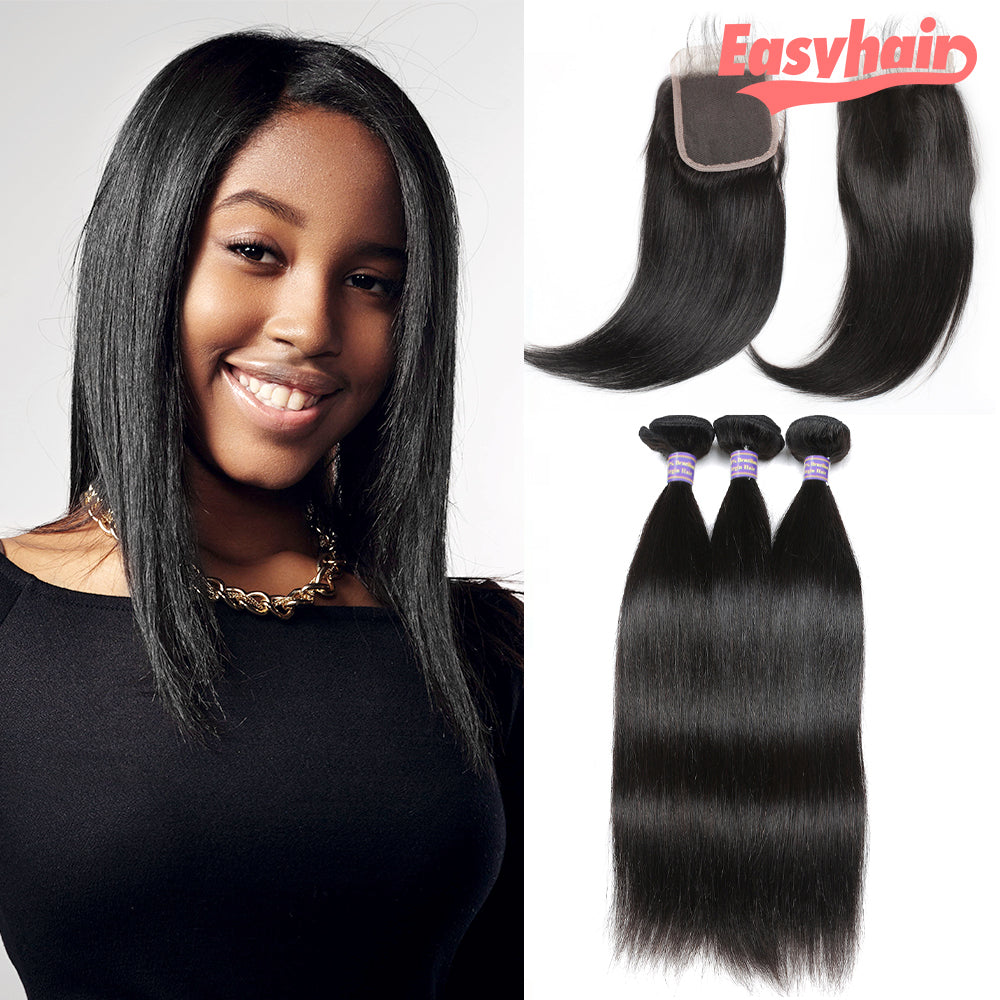 Easy Hair 10A Unprocessed Peruvian Silky Straight Human Hair 3 Bundles With Lace Closure